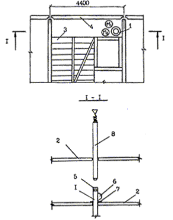 1 - установленная труба; 2 - лестничная площадка; 3 - лестничный марш; 4 - стеновая панель; 5 - муфта; 6 - загрузочный клапан; 7 - хомут; 8 - устанавливаемая труба