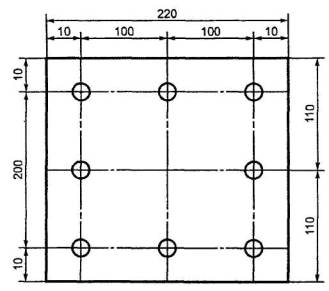 Шаблон металлический или пластмассовый размерами [2(20´220)±2] мм толщиной (1,5±0,5) мм, с вырезанным в нем квадратом [(200´200)±1,0] мм, имеющий восемь отверстий, предназначенных для нанесения меток на пробу (рисунок 1).