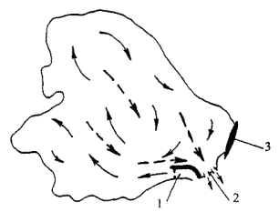 Зона циркуляции - акватория водоема-охладителя, занятая транзитным потоком и смежными водоворотами.