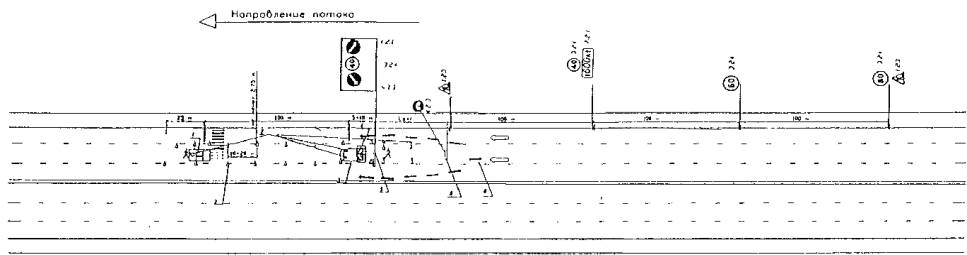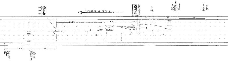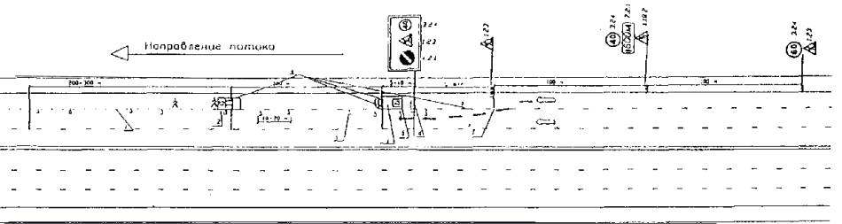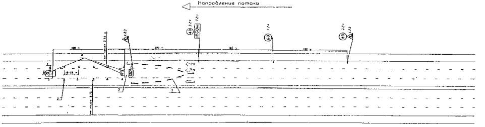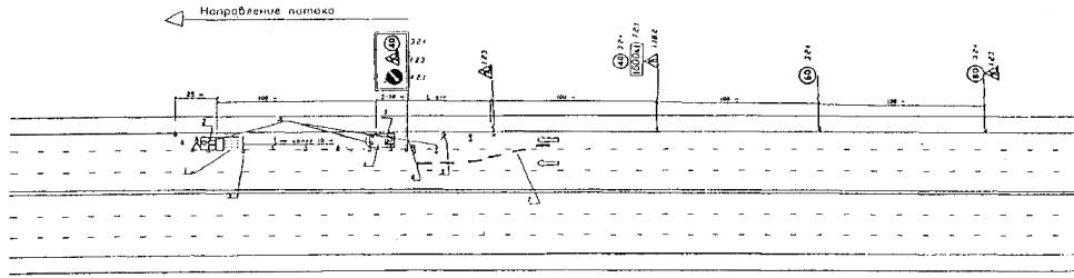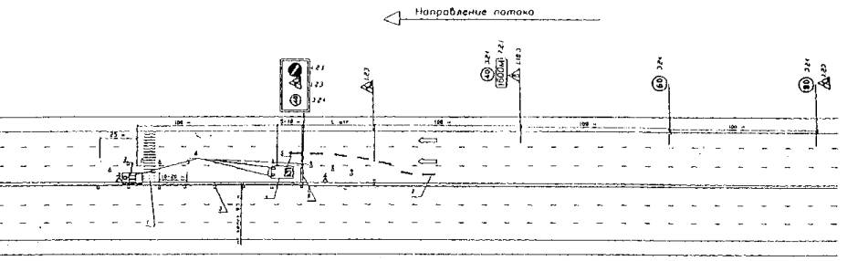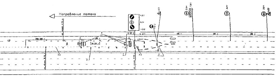 1 - предварительная разметка; 2 - сигнальные фишки (конуса) со светоотражающей поверхностью; 3 - машина прикрытия; 4 - импульсная стрелка (d 900; 1200); 5 - направление объезда транспорта; 6 - сигнальный фонарь.