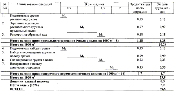 М1 - зарезает отвалом бульдозера на первой передаче растительный слой и укладывает его в продольный валик. Снятие слоя начинают от границ полосы срезки с обеих сторон, каждым последующим проходом приближаясь к оси трассы. |