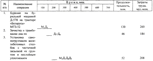 Д1 производит строповку столбов. М2 снимает самопогрузчиком столб и опускает его в подготовленную яму. Д2 проверяет шаблоном установку столба в проектное положение. Д3 производит частичную подсыпку грунта с трамбованием. Д1 - Д3 производят закрепление столбов в проектном положении с засыпкой грунтом и трамбование. |