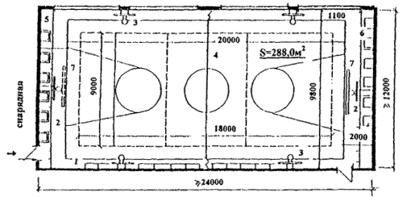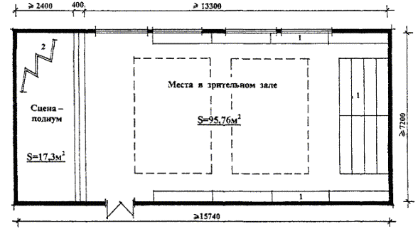Рис. П.35. Актовый зал на 80 мест. Вариант расстановки оборудования при использовании зала для танцев и массовых игр.