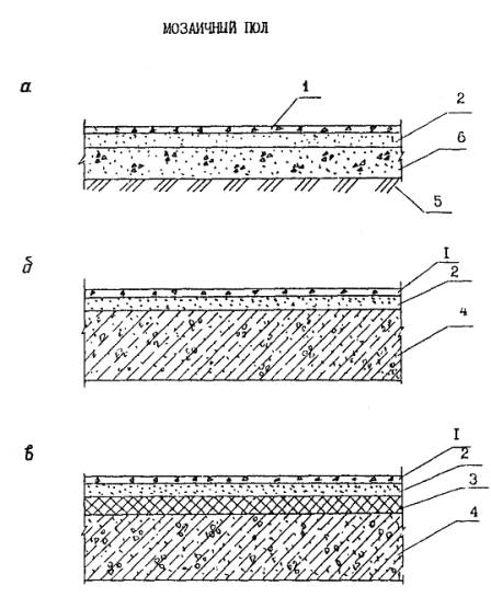 Мозаичное покрытие пола может устраиваться по бетонному подстилающему слою, по железобетонным плитам перекрытия и по цементно-песчаной стяжке, уложенной на тепло- или звукоизоляционный слой.