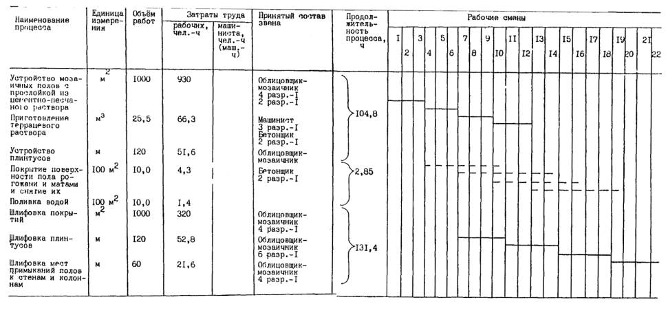 Устройство мозаичного покрытия пола ведётся бригадой из 4 звеньев общей численностью 14 человек.