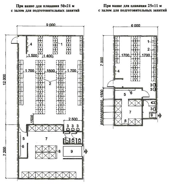1 - двухъярусные закрытые шкафы; 2 - скамьи для переодевания; 3 - умывальник; 4 - сушилка для волос; 5 - преддушевая; 6 - вешалка для полотенец; 7 - душевая; 8 - стеллаж для мыла; 9 - ножной проходной душ