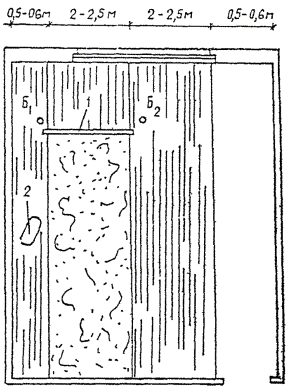2.13. Раствор укладывают полосами, ограниченными двумя соседними маяками. Укладку раствора в полосы производят через одну. Укладка начинается от стены, противоположной входным дверям и ведется в направлении двери. Поверхность уложенного слоя раствора должна быть выше верха маяков на 2 - 3 мм (рис. 4 и 5).