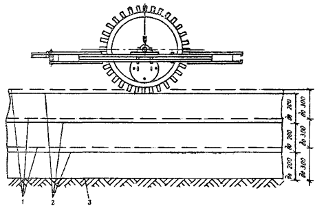 1 - уровень поверхности подсыпаемого грунта для послойного уплотнения; 2 - уровень поверхности грунта, уплотненного послойно; 3 - существующий уровень поверхности земли