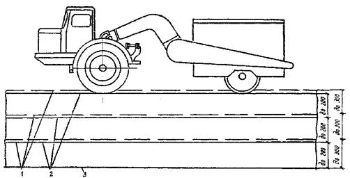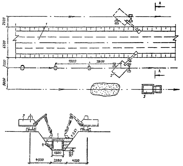 1 - коллектор; 2 - экскаватор-планировщик ЭО-3332А; 3 - автомобиль-самосвал ЗИЛ-ММЗ-555; 4 - зона разравнивания грунта вручную