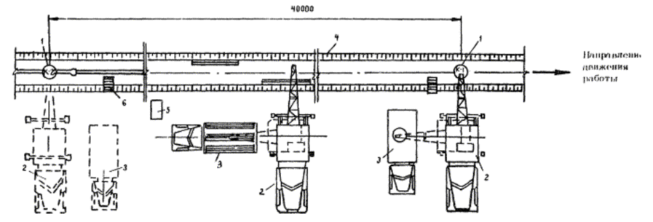 1 - автокран; 2 - сваренные в звенья трубы; 3 - уложенные трубы; 4 - железобетонный колодец; 5 - «полотенце»; 6 - ПЭ труба