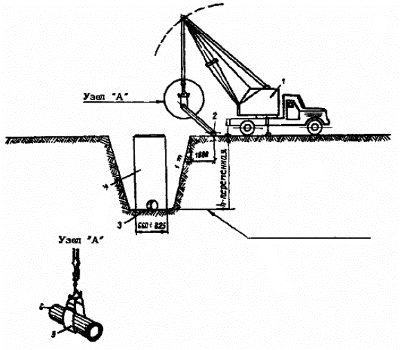1 - установленные в проектное положение железобетонные колодцы; 2 - место установки автокрана для монтажа железобетонных колодцев и ПЭ труб; 3 - автомашина; 4 - откосы траншеи; 5 - ларь для инструментов; 6 - лестница для спуска рабочих в траншею