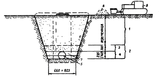 1 - обратная засыпка грунта бульдозером; 2 - обратная засыпка экскаватором-планировщиком; 3 - разравнивание грунта экскаватором-планировщиком; 4 - разравнивание грунта вручную; 5 - ПЭ труба; 6 - экскаватор-планировщик; 7 - канализационный колодец; 8 - грунт для обратной засыпки; 9 - бульдозер