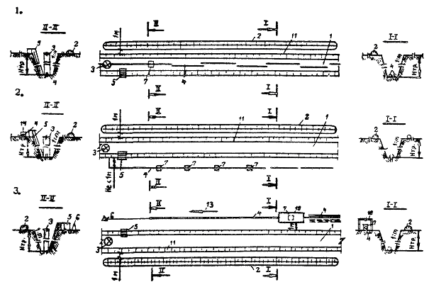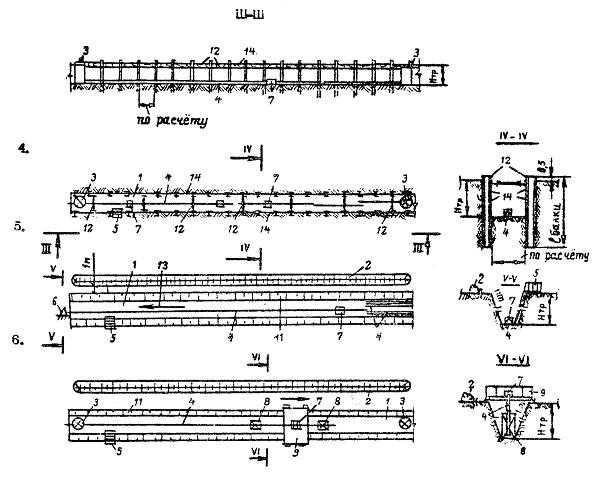 1 - траншея; 2 - отвал грунта; 3 - канализационный колодец; 4 - ПЭ трубы; 5 - лестница; 6 - лебедка; 7 - установки для сборки соединений ПЭ труб; 8 - опорные стойки; 9 - передвижная платформа; 10 - навес (или бытовка); 11 - откос; 12 - элементы креплений траншеи; 13 - направление движения ПЭ трубы к лебедке; 14 - доски-забирки