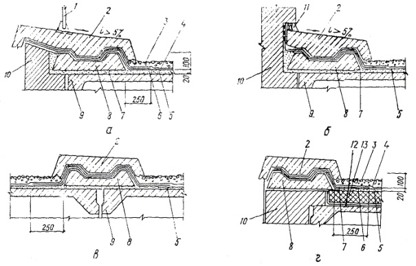 а - к низкому кирпичному парапету; б - к внутренней кирпичной стене; в - в местах стыковки ковров на смежных захватках; г - к наружной кирпичной стене машинного помещения; д - к карнизу кирпичной стены машинного помещения; е - к вентиляционной шахте; ж - к фановым стоякам; 1 - металлическое ограждение; 2 - сборный прижимной элемент; 3 - пригрузочный слой; 4 - разделительный слой; 5 - сборный кровельный ковер; 6 - защитный фартук; 7 - подстилающий слой; 8 - сборный подкладочный элемент; 9 - несущая плита покрытия; 10 - кирпичная стена; 11 - заделка цементным раствором; 12 - пароизоляция; 13 - теплоизоляция; 14 - слив из оцинкованной кровельной стали; 15 - герметизирующая мастика; 16 - вентиляционная шахта; 17 - сварной патрубок из стального листа; 18 - конусообразный фартук из оцинкованной кровельной стали с хомутом и прокладкой из резины; 19 - фановый стояк (труба); 20 - пеньковое волокно