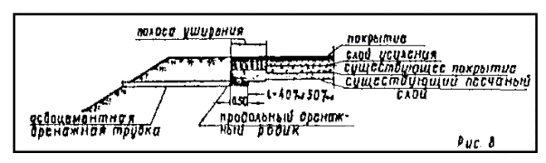 а) Устройство продольных ровиков у края дорожной одежды, заполнение их дренирующим материалом и отвод воды из ровиков дренажными воронками или трубчатыми дренами. Это мероприятие удобно применять в тех случаях, когда проектируется уширение существующих покрытий.
