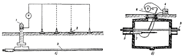 а) соединение с заземлением провода ПС-70 или шины для защитных контуров; б) соединение с заземлением проводов для искровых промежутков