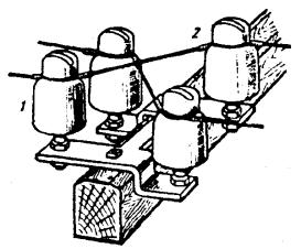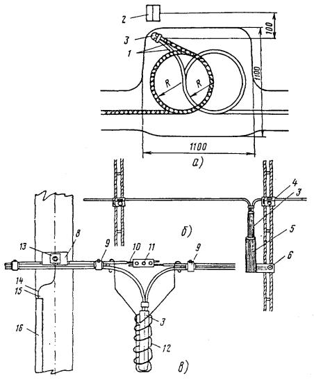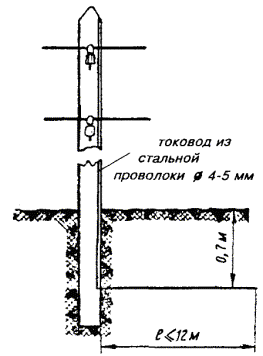 Если заземление предназначено для кабельного ящика, запирающей или дренажной катушки, то от заземлителей вдоль опоры прокладывают два токоотвода из проволоки диаметром 4 - 5 мм, один из которых присоединяют к корпусу кабельного ящика или к заземляющему зажиму запирающей катушки, а другой прокладывают до вершины опоры.