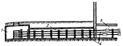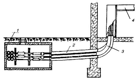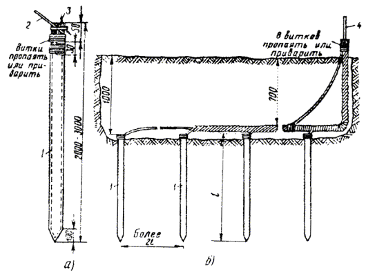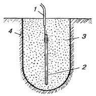1 - провод ПР или ПРЖ сечением 6 - 10 мм2; 2 - заземлитель; 3 - насыпной грунт; 4 - основной грунт