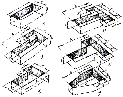 а) из нескольких электродов угловой стали (или стальных труб); б) двухлучевой протяженный; в) трехлучевой протяженный; г) четырехлучевой протяженный; д) единичные электроды, расположенные по замкнутому контуру