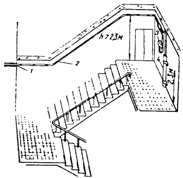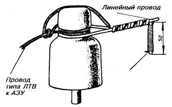 Для разрядников, расположенных внутри здания, токоотводы от заземлителей следует прокладывать по стене до ввода в здание. Перед вводом в здание проводник от заземлителей припаивают к изолированному проводу сечением не менее 1,5 мм2 и через отдельное отверстие в стене проводят непосредственно к разряднику. Молниеотвод, прокладываемый по стене здания, необходимо закрыть деревянной рейкой на высоту 2,5 м от уровня земли.