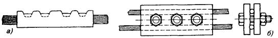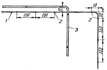 18.55. Для соединения вертикальных электродов между ними следует прокопать траншею шириной 20 - 30 см и глубиной 0,5 - 0,7 м, на дно которой укладывают соединительные провода или шины. В качестве соединительных используют стальные шины (полосовая сталь) сечением 40´4, 30´4, 25´4 мм. Шины нужно уложить на ребро и приварить к уголкам или трубчатым электродам. Вместо стальных шин можно применять стальные провода ПС-70 или биметаллические сталемедные провода диаметром 4 - 6 мм. Соединение электродов из уголков с помощью стальной шины показано на рис. 18.11.