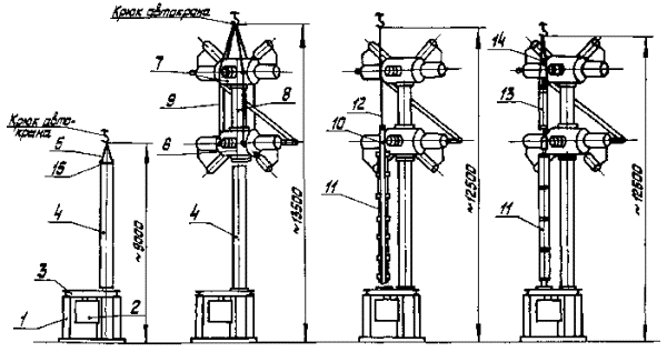 1 - площадка для разгрузки и укрупнительной сборки; 2 - дугогасительное устройство; 3 - опорный изолятор в упаковке; 4 - конденсаторы в упаковке; 5 - изоляторы колонны управления в упаковке; 6 - рама; 7 - стол монтажный; 8 - опорные конструкции; 9 - распределительный шкаф; 10 - автокран К-162; 11 - автогидроподъемник АГП-22; 12 - шкаф клеммных сборок; 13 - шкаф управления.
