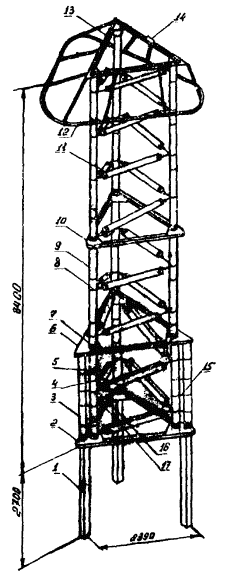 1 - кольцо экранирующее; 2 - рамы верхняя и промежуточная; 3 - опора; 4 - рама нижняя; 5 - настил из досок; 6 - площадка разгрузки ящиков с изоляторами и элементами