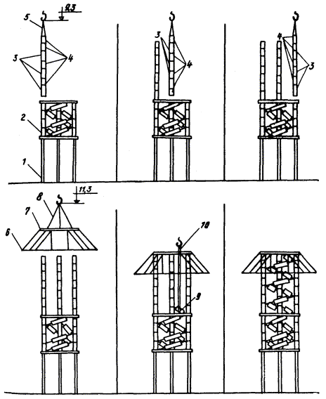 На верхние фланцы нижних элементов, а также на фланцы остальных элементов устанавливают крышки со скобами.