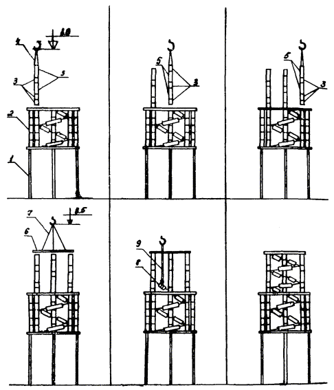 2.3.8. Навешивают элементы начиная с нижнего с помощью стропа из капронового каната КК 30 мм 56 ктекс Об ГОСТ 10293-77. Вначале укрепляется верх элемента, а затем низ (верх элемента определяется по табличке с порядковым номером элемента, установленной на верхнем фланце).