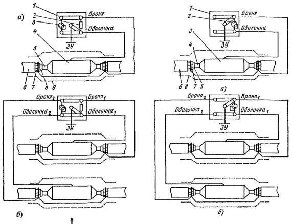 Для защитных покровов типа Бп протекторные установки в случае необходимости подключаются через КИП-2 только к броне кабеля, а между оболочкой и броней включается разрядник Р5 (рис. 4).