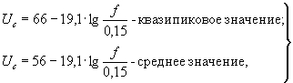В полосе частот от 0,15 до 0,5 МГц на линиях заходящих в жилые дома допускаемые значения напряжения индустриальных радиопомех Uc в децибелах относительно 1 мкВ вычисляют по формулам: