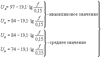 В полосе частот от 0,15 до 0,5 МГц допускаемые значения напряжения индустриальных радиопомех Uл в децибелах относительно 1 мкВ вычисляют по формулам: