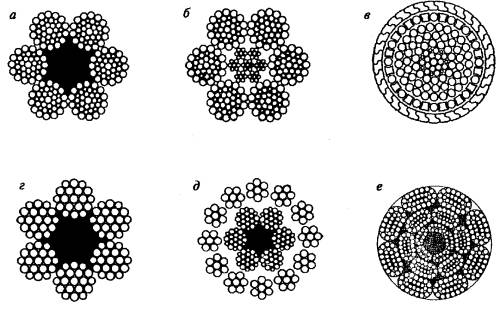 а - по ГОСТ 3077-80; б - по ГОСТ 7665-80; в - по ГОСТ 3079-80; г - канаты из пластически обжатых прядей ПК; д - по ТУ 14-4-1444-87-Б, ГОСТ 7668-80; е - по ГОСТ 2688-80