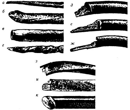 а - излом, вызванный сильным абразивным изнашиванием; б - излом при изгибе; в - излом при растяжении; г - излом, вызванный коррозией при растяжении; д - усталостный излом; е - неоднородный усталостный излом; ж - излом, вызванный коррозионной усталостью; з - вязкий излом при абразивном изнашивании; и - мартенситный излом; к - сдвиговый излом
