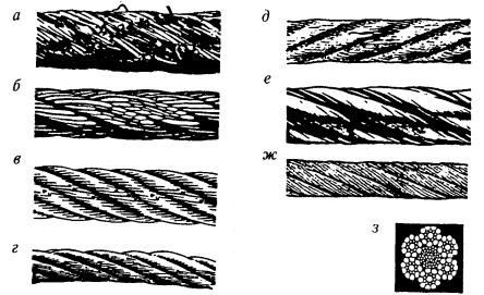 а - механическое повреждение в результате движения каната по острым выступающим краям под нагрузкой; б - местное абразивное изнашивание в результате трения об опорные конструкции. Вибрация каната на участке между барабаном и головным шкивом стрелы; в - узкая полоса абразивного изнашивания, приводящая к усталостному разрушению, вызванная движением каната в желобе с чрезмерно широким профилем или в маленьких блоках; г - две параллельные линии оборванных проволок, указывающие на изгиб в результате движения по желобу с узким профилем; д - сильное абразивное изнашивание, вызванное высоким давлением на контактной поверхности. Выпучивание главного волокнистого сердечника; е - сильное абразивное изнашивание каната параллельной свивки, вызванное абразивным трением по выступающим точкам при многослойной навивке на барабан; ж - сильная коррозия в результате погружения каната в воду с химическими добавками; з - внутренняя коррозия, очевидная, хотя на внешней поверхности каната мало что указывает на наличие износа. Полное отсутствие зазора между прядями является признаком внутреннего разрушения;
