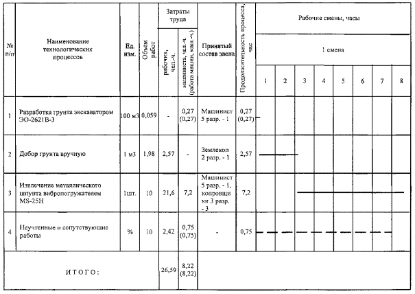 6.1 Трудоемкость выполнения работ по извлечению металлического шпунта вибропогружателем MS-25H, характеризующая использование материально-технических и трудовых ресурсов, определена в калькуляции трудовых затрат и машинного времени по «Единым нормам и расценкам на строительные, монтажные и ремонтно-строительные работы» и приведена в таблице 7.