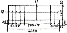 Каждый каркас под сборные ж/б панели ПН-1, ПН-1А состоит из двух КР-1, КР-1 состоит из 55 штук поперечных стержней Ø 12 АII длиной 590 мм и 3-х продольных стержней Ø 6 АI длиной 4200 мм. Раскладку стержней, их шаг, линии сгиба смотри спецификацию арматуры на 1 марку. Выпуски под каркас КР-4 колонн КМ-1, КМ-2, КМ-3 выполняются из вертикальных арматурных стержней Ø 18 А-II (1) длиной 935 мм в количестве 8 штук под одну колонну. Для пространственной жесткости вертикальных стержней устанавливается внутренний 4-х угольник из стали Ø 6 А-I на расстоянии 35 мм от нижних концов выпусков. Наружный 4-х угольник из стали Ø 6 А-I устанавливается на расстоянии 250 мм от внутреннего.