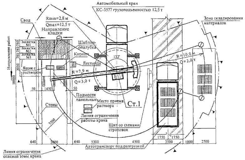 2.15 Схема разгрузки автотранспорта и подачи материалов в рабочую зону автокраном КС-3577 представлена на рисунке 5.