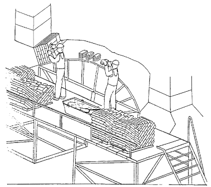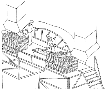Кладку ведут отдельными участками одновременно от пят к вершине. Кладка участка завершается заклиниванием свода замковыми кирпичами. По выложенной части свода нельзя ходить и складировать на ней материалы. Распалубку свода выполняют через 10 - 20 суток.