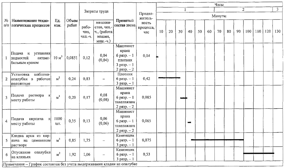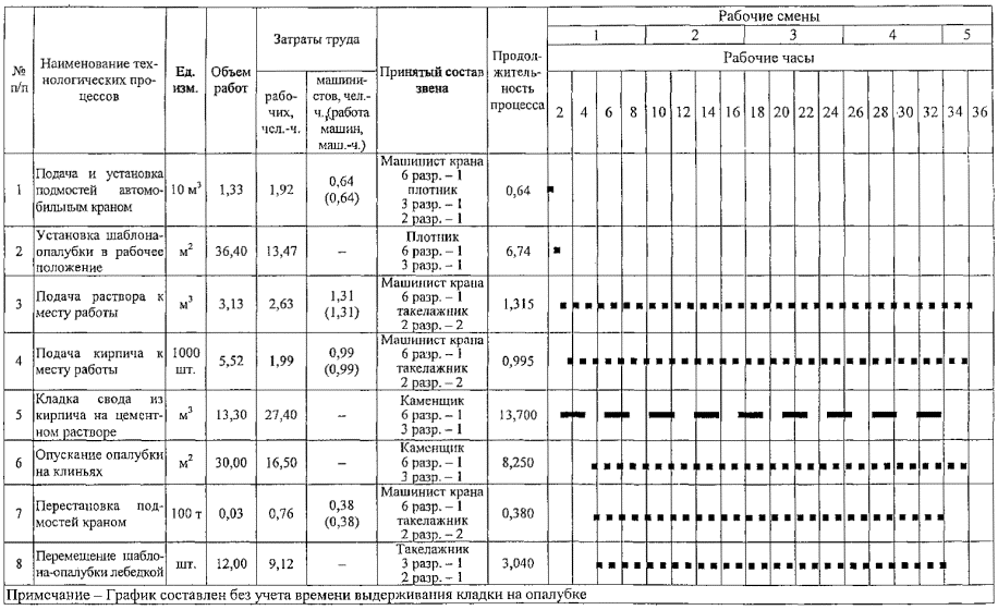 2.17 Кирпичная кладка арок и сводов выполняется в одну смену звеном в количестве 8 человек. Состав звеньев по профессиям и распределение работы между звеньями представлены в таблице 2.