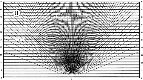 1. Накладываем график II для расчета КЕО методом A.M. Данилюка на план исследуемого помещения таким образом, чтобы его вертикальная ось совместилась с характерным разрезом помещения, а полюс графика «О» совместился с расчетной точкой С; подсчитываем по графику II количество лучей, проходящих от части фасада (участок 1-2) экранирующего здания через световой проем.