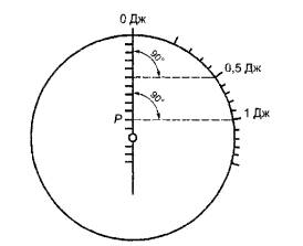 Другие точки шкалы получают следующим образом. Через центр окружности и точку «0 Дж» проводят прямую линию. Ортогональная проекция точки «1 Дж» на эту прямую обозначена буквой Р. Промежуток между «0 Дж» и Р делят на 10 равных частей. Через каждую точку деления проводят перпендикуляры к прямой «0 Дж - Р». Точки пересечения перпендикуляров с окружностью соответствуют значениям энергии удара 0,1; 0,2; 0,3, ..., 0,9 Дж. Этот же принцип может быть использован для нанесения делений на шкалу за точкой «1 Дж».