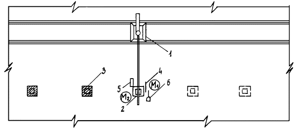 Монтажник М1 закрепляет отвес в месте пересечения проволочных осей и вместе с монтажником М2 при натянутом стропе рихтует фундамент, добиваясь полного совмещения шнура отвеса с рисками на верхней грани стакана. Затем он подает команду машинисту крана ослабить строп и, вертикально установив шаблон на дне стакана, по совпадению риски на шаблоне с разбивочной осью здания проверяет правильность установки фундамента по высоте |
