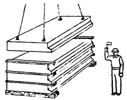 Такелажник стропит лестничную площадку, отходит от нее на 4 - 5 м и подает команду машинисту крана приподнять площадку на 20 - 30 см. Убедившись в надежности строповки, он сигнализирует машинисту на подачу площадки к месту монтажа |