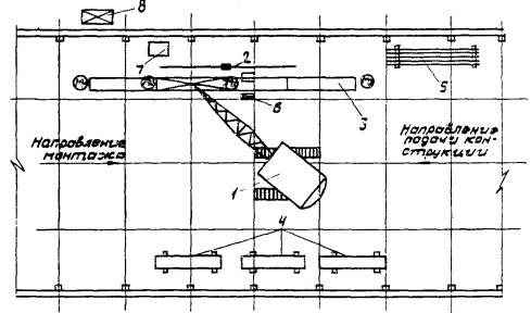 1 - монтажный кран; 2 - строп четырехветвевой; 3 - кондуктор; 4 - плиты ПКЖ; 5 - стеллаж с заготовками затяжек и подвесов; 6 - шкаф для хранения накладных деталей, шайб и гаек; 7 - ящик для инструментов; 8 - сварочный пост