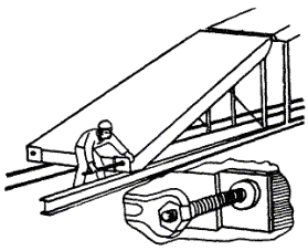 УСТАНОВКА ЗАТЯЖЕК; 12 мин; М1, М4; щетка стальная, гаечные ключи Монтажник М4 подносит ранее заготовленные арматурные стержни с болтами приваренными к их концам и укладывает их на кронштейны кондуктора, расположенные на уровне отверстий в опорных плитах. Монтажник М1, очистив отверстия щеткой заводит и протягивает сквозь них затяжки. Затем, смазав солидолом резьбу болтов, монтажники М1 и М4 надевают на них шайбы и навинчивают гайки. После сварки затяжек монтажники М1 и М4 производят натяжение затяжек до тех пор, пока промежуточные плиты в коньковой части не приподнимутся над кондуктором на 40 мм