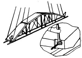 УСТАНОВКА ПОДВЕСОВ; 18 мин; М1, М4; гаечные ключи, метр Монтажник М4 заводит нижнюю часть подвеса на затяжку. Монтажник М1, поднявшись на свод, пропускает сверху в зазор между плитами верхнюю часть подвеса. Остальные подвесы они устанавливают так же. После того, как монтажники М2 и М3 закончат сварку подвесов, монтажники М1 и М4 подтягивают подвесы, закручивая гайки