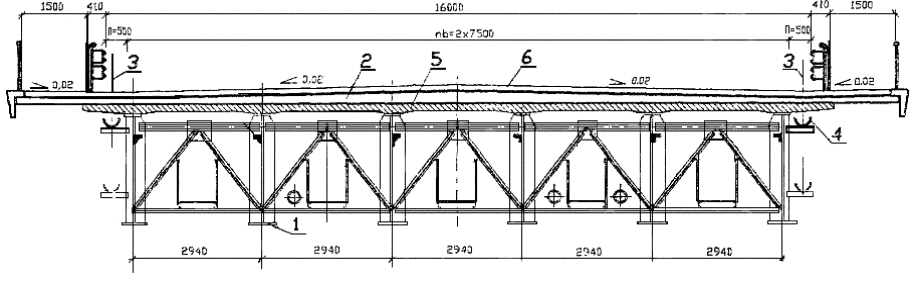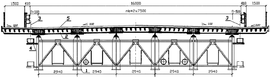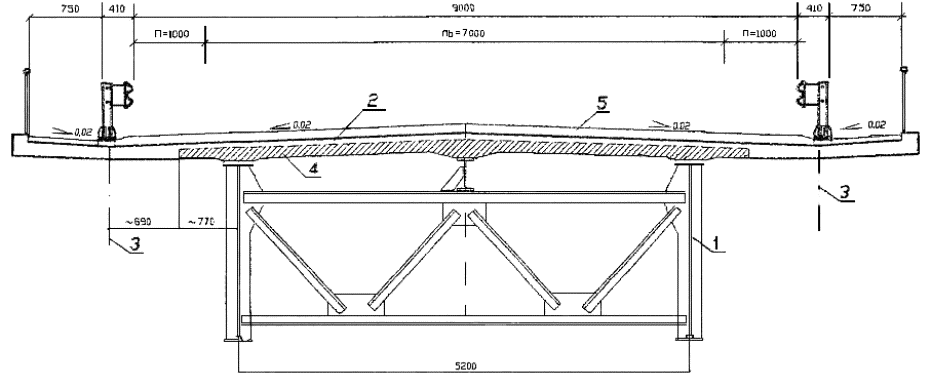3.2 сталежелезобетонные конструкции: Пролетные строения со стальными и железобетонными элементами, совместно работающими в составе единой конструкции. Применительно к сталежелезобетонным пролетным строениям автодорожных мостов конструктивным железобетонным элементом является железобетонная плита проезжей части, объединяемая с металлическими несущими элементами: главными балками (фермами), продольными и поперечными балками, при уровне проезда поверху, понизу, по середине;