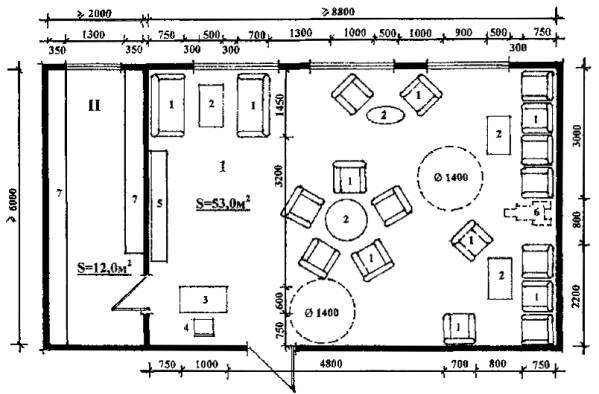 Рис. П.7. Комната тихого отдыха отделения дневного пребывания несовершеннолетних. Расстановка оборудования: а) для отдыха; б) для групповых психолого-коррекционных занятий.