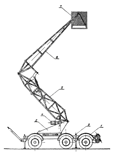 1 - ходовая часть, 2 - поворотная часть, 3 - выносные опоры, 4 - подъемное устройство, 5 - нижняя секция мачты, 6 - верхняя секция мачты, 7 - люлька
